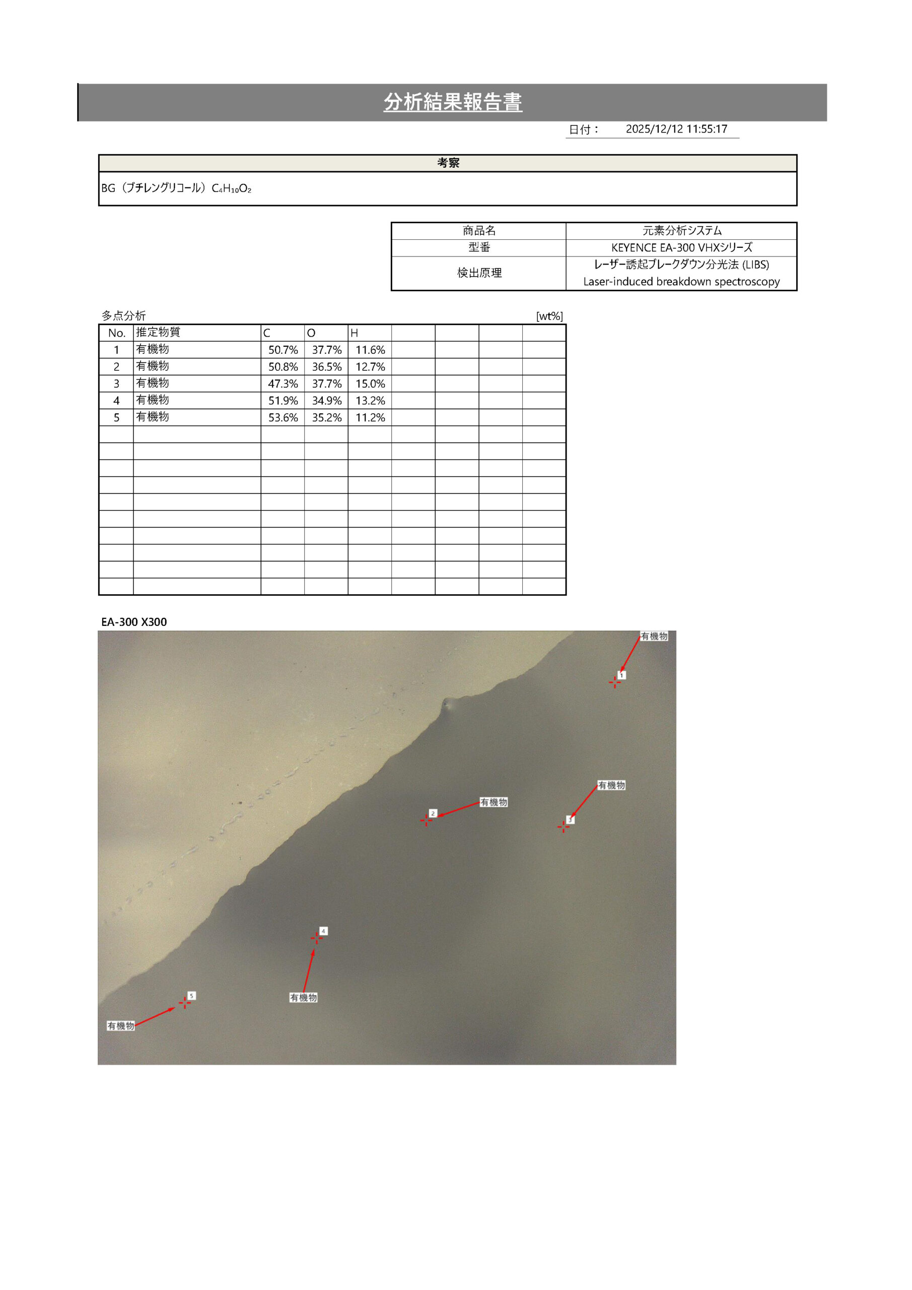 レーザー誘起ブレークダウン分光法(LIBS)による多点元素分析を実施。測定点では C・H・O のみが検出され、その元素比はブチレングリコールの理論組成と概ね一致しており、BG由来の有機成分が主要成分であることを確認しました。
