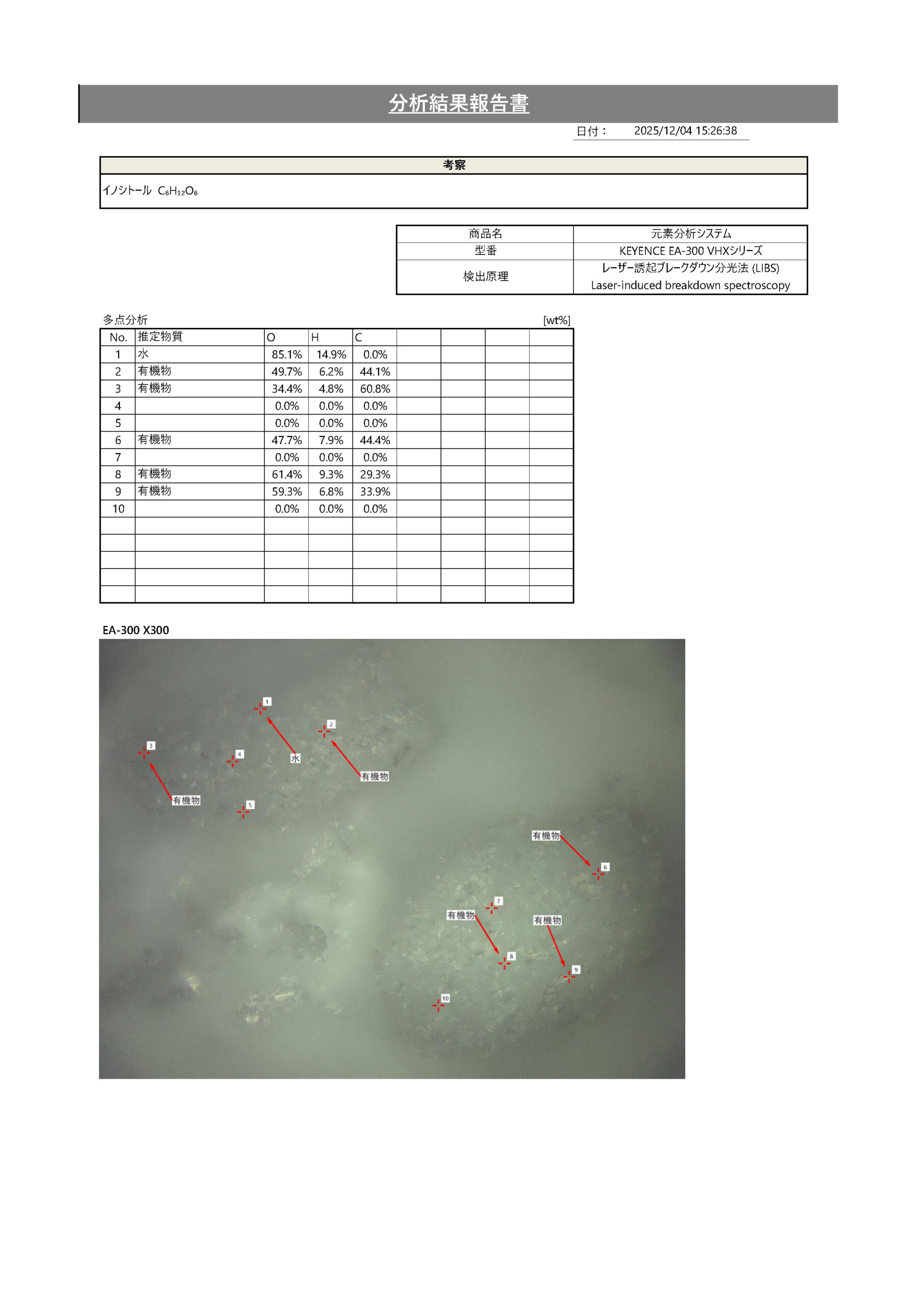 - 結果概要:有機物として分類される領域(No.2,3,6,8,9)ではO約34〜61wt%、C約29〜61wt%、H約5〜9wt%を示し、 これらの比率はイノシトールの組成比(O約53wt%、C約40wt%、H約7wt%)と良好に整合する結果が得られました。