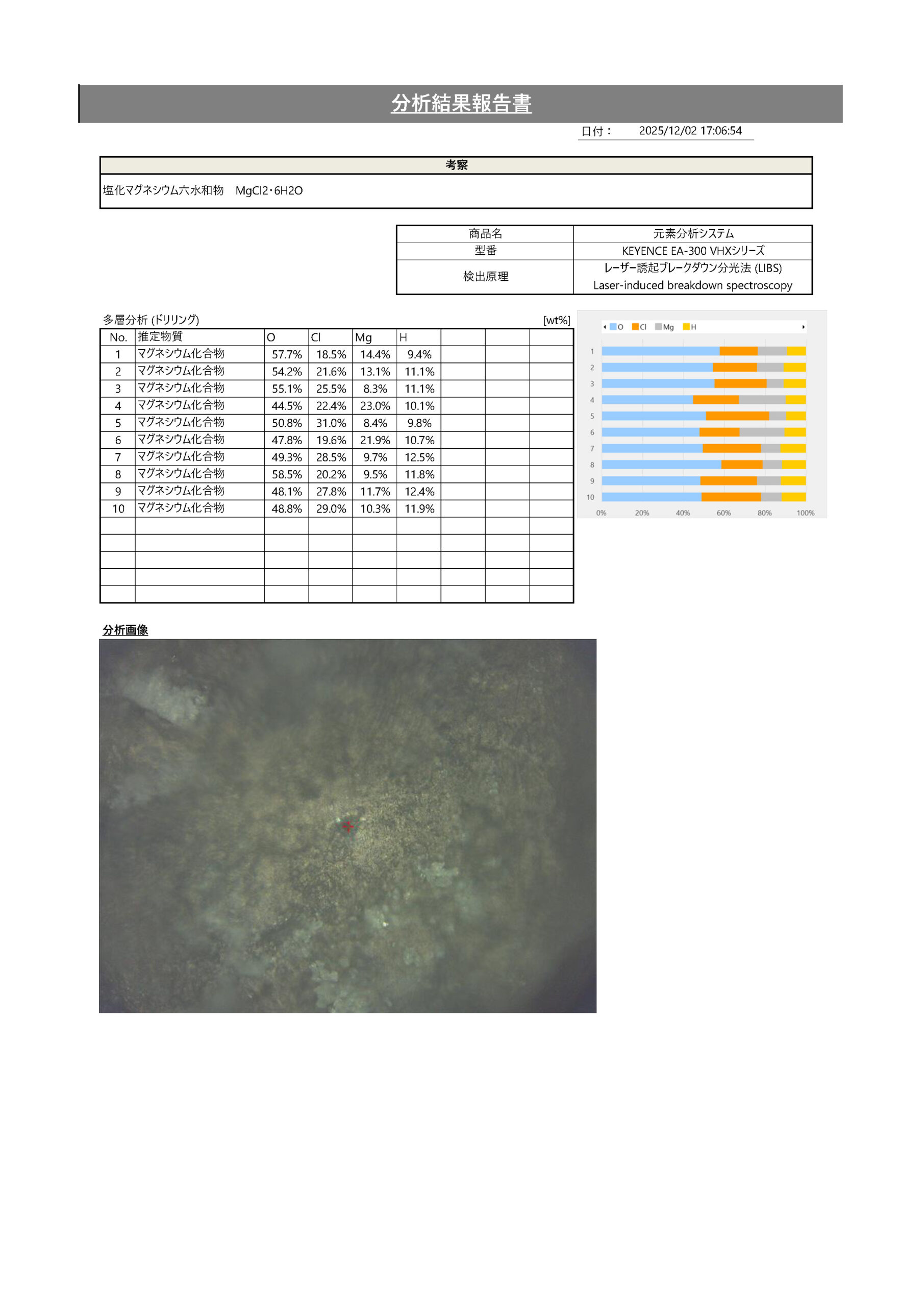 - 結果概要:Mg含有率は約8〜23wt%であり、O・Cl・H比から塩化マグネシウム六水和物としての構造を確認。