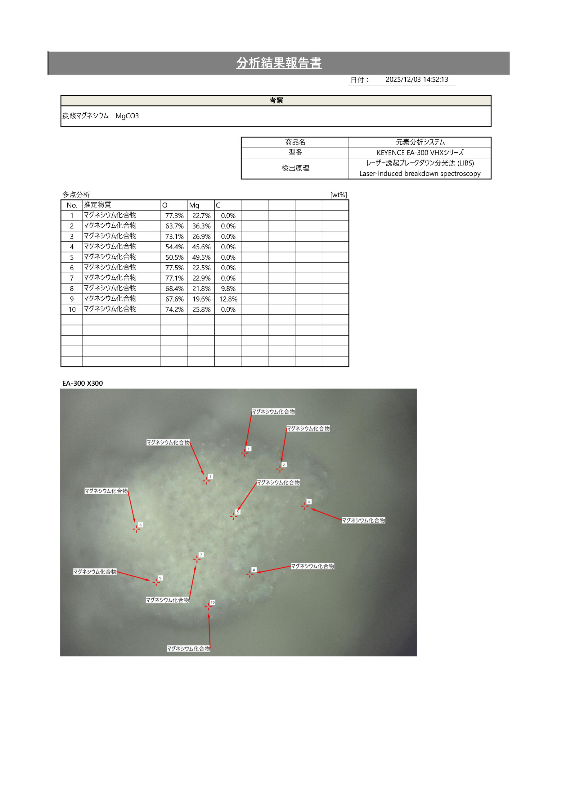 - 結果概要:Mg含有率は約20〜50wt%であり、O・Mg・Cの比率から炭酸マグネシウムとしての組成・構造を確認。