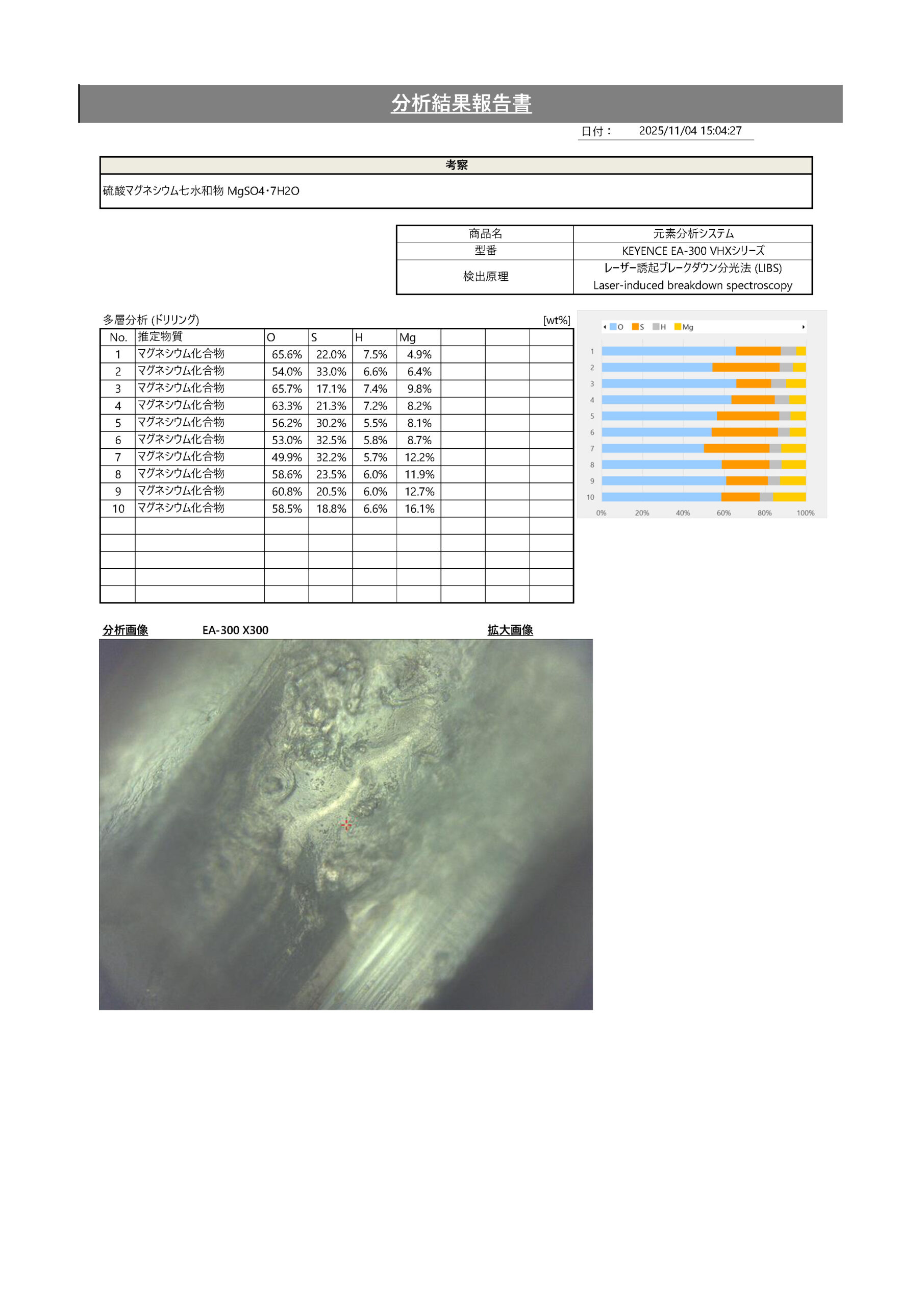 - 結果概要:Mg含有率は約10〜16%wtであり、O・S・H比から硫酸マグネシウム七水和物としての構造を確認。