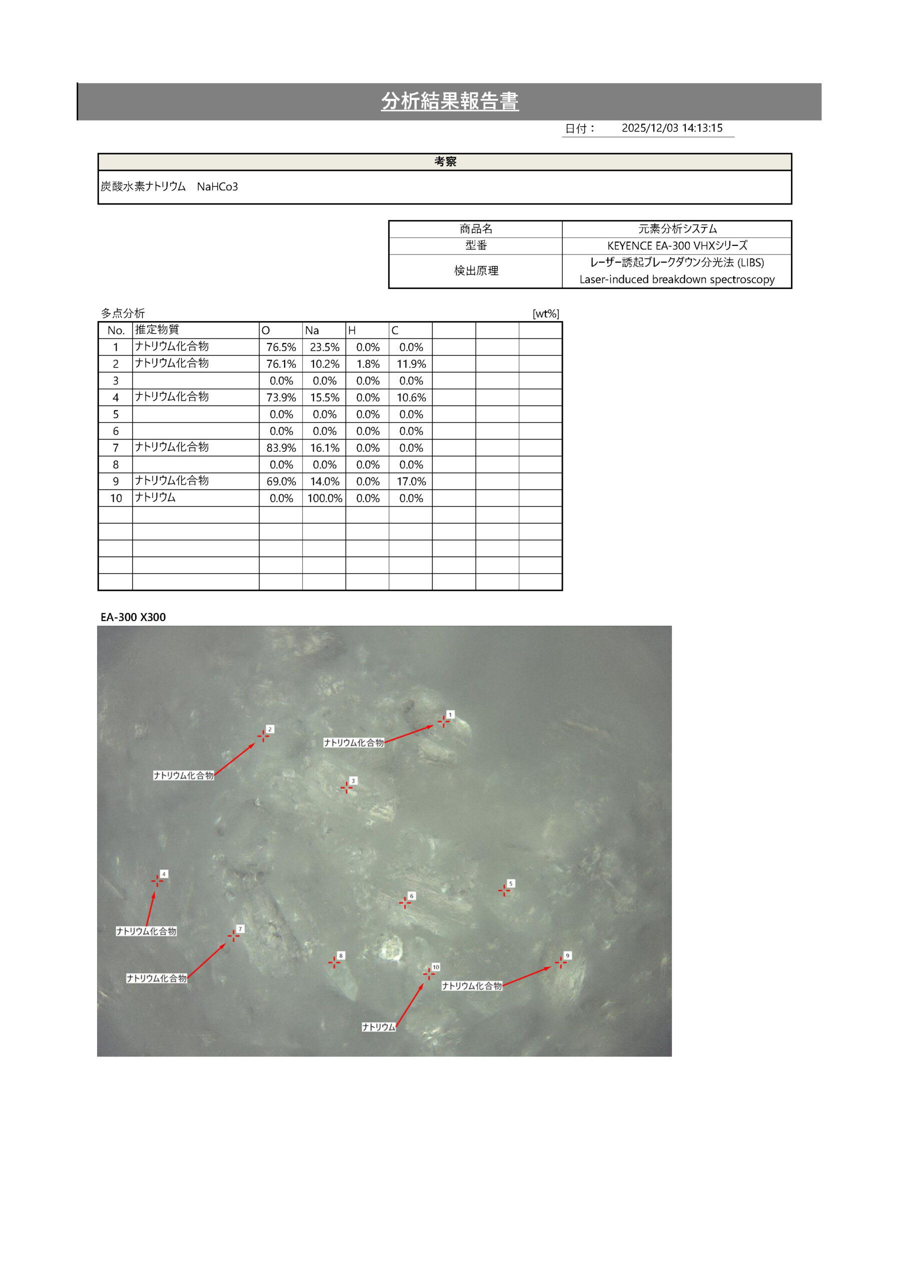 - 結果概要:Na含有率は約10〜24wt%であり、O・Na・C・Hの比率から炭酸水素ナトリウムとしての組成・構造を確認。