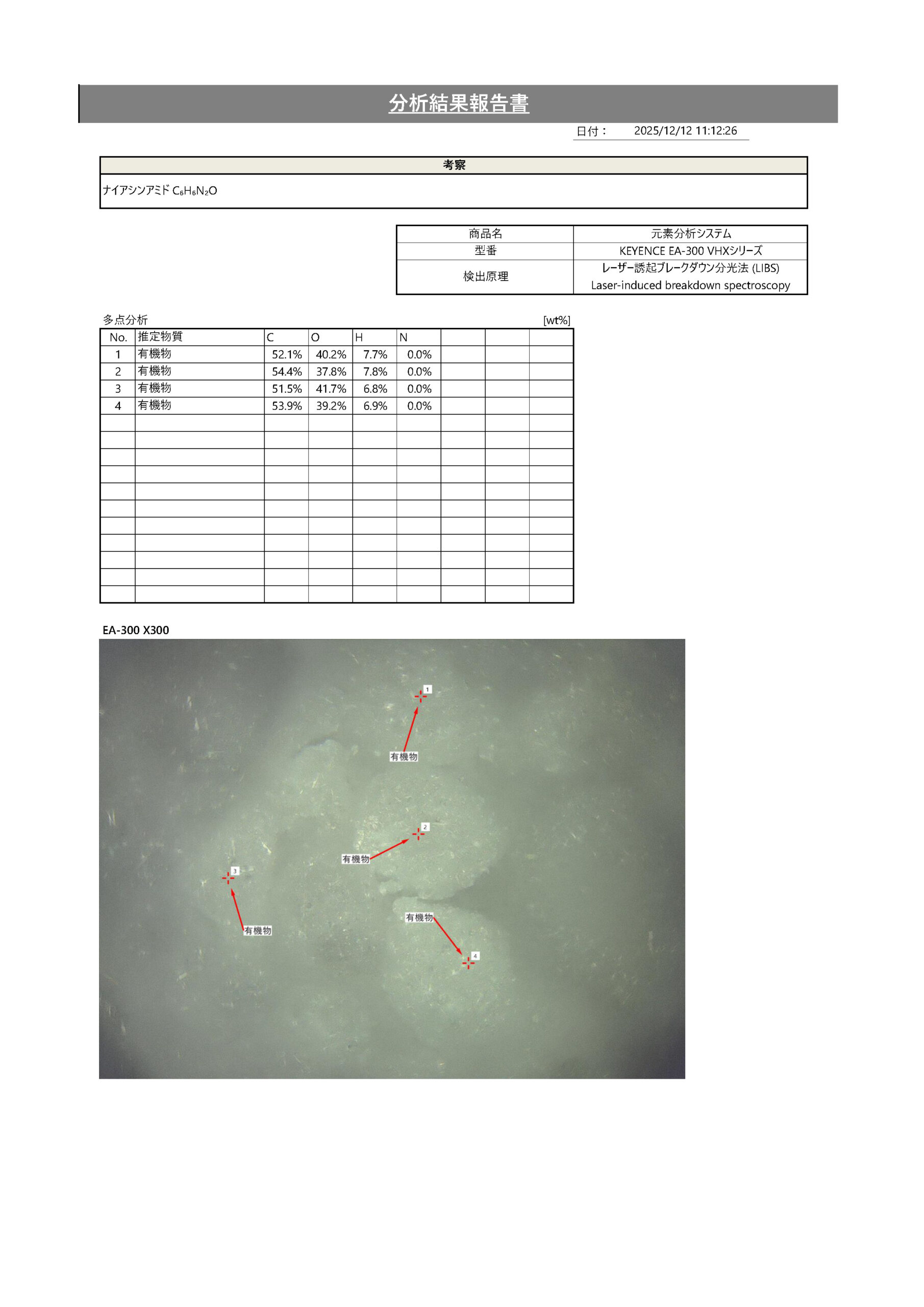 - 結果概要:有機物として分類される領域ではC約52〜54wt%、O約38〜42wt%、H約7wt%前後を示し、これらの元素比はナイアシンアミドの組成範囲と概ね整合する。
