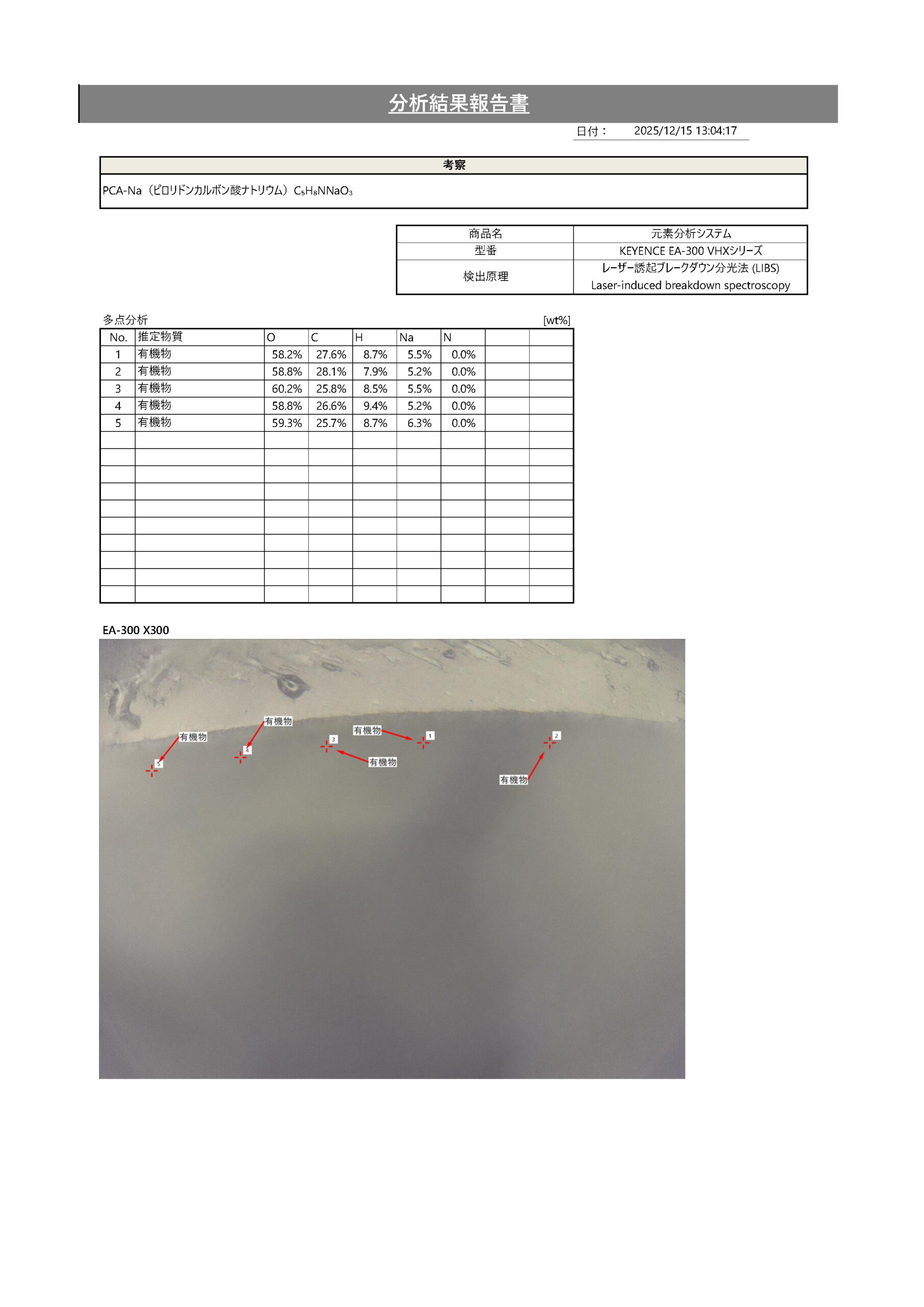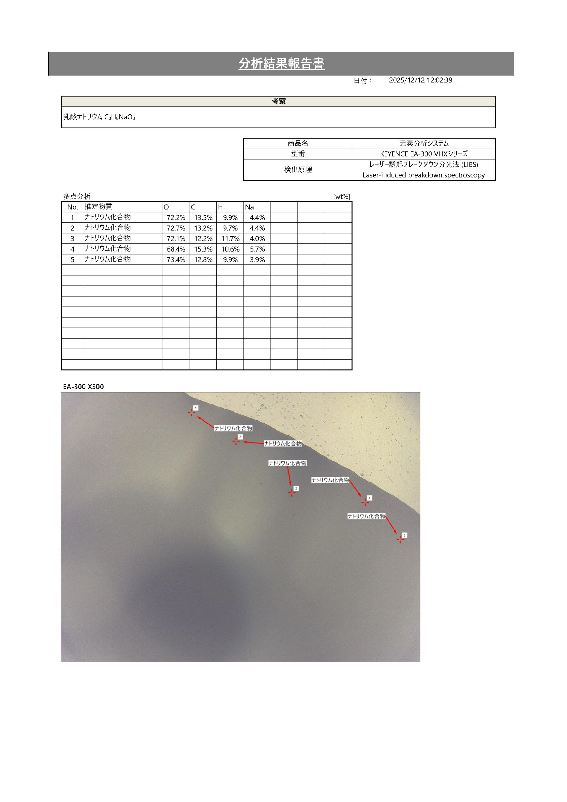 - 結果概要:O約68.4〜73.4wt%、C約12.2〜15.3wt%、H約9.7〜11.7wt%、Na約3.9〜5.7wt%(平均約4.5wt%)を示し、Naを含む有機成分(乳酸ナトリウム)として整合する結果が得られました。