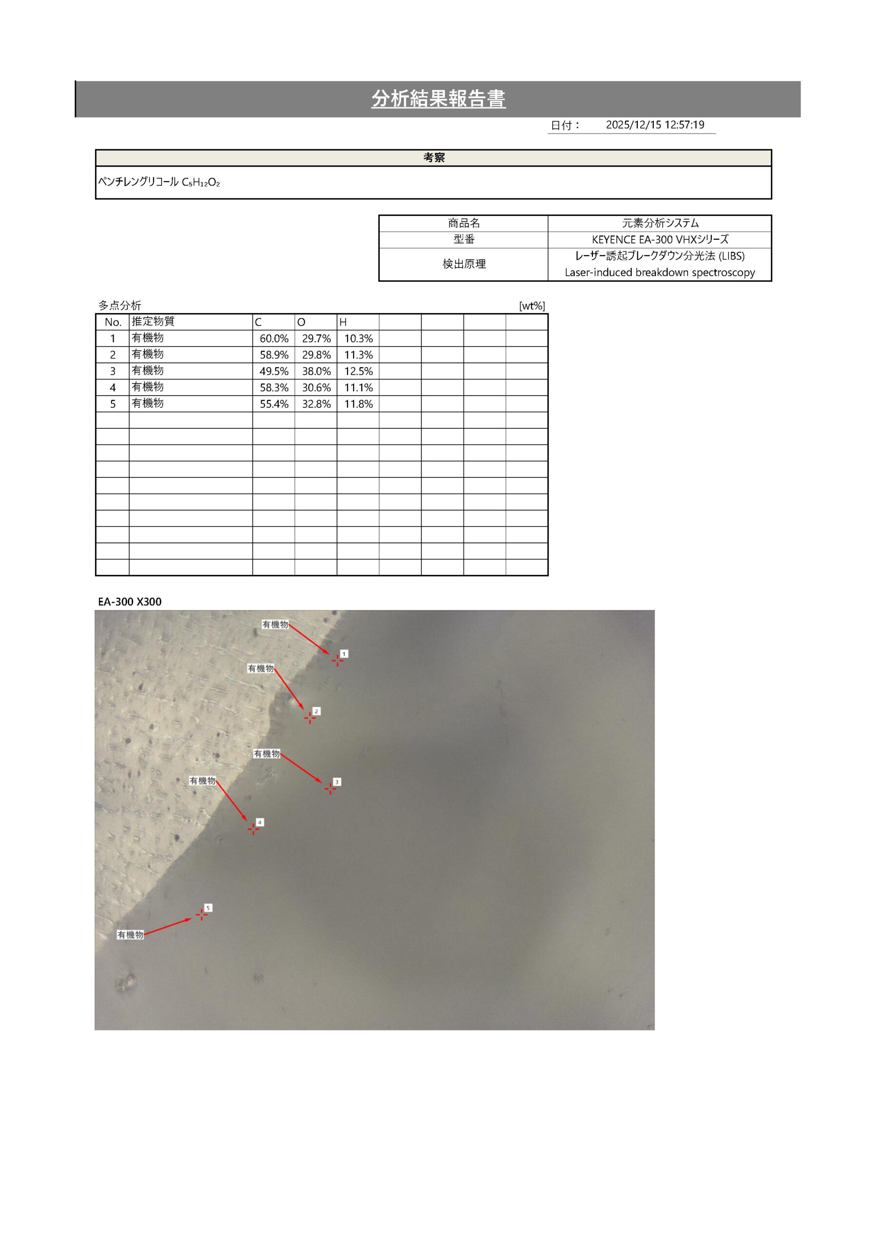 レーザー誘起ブレークダウン分光法(LIBS)による多点元素分析を実施。測定点では C・H・O のみが検出され、その元素比は、ペンチレングリコールの理論組成と概ね一致しており、ペンチレングリコール由来の有機成分が主要成分であることを確認しました。