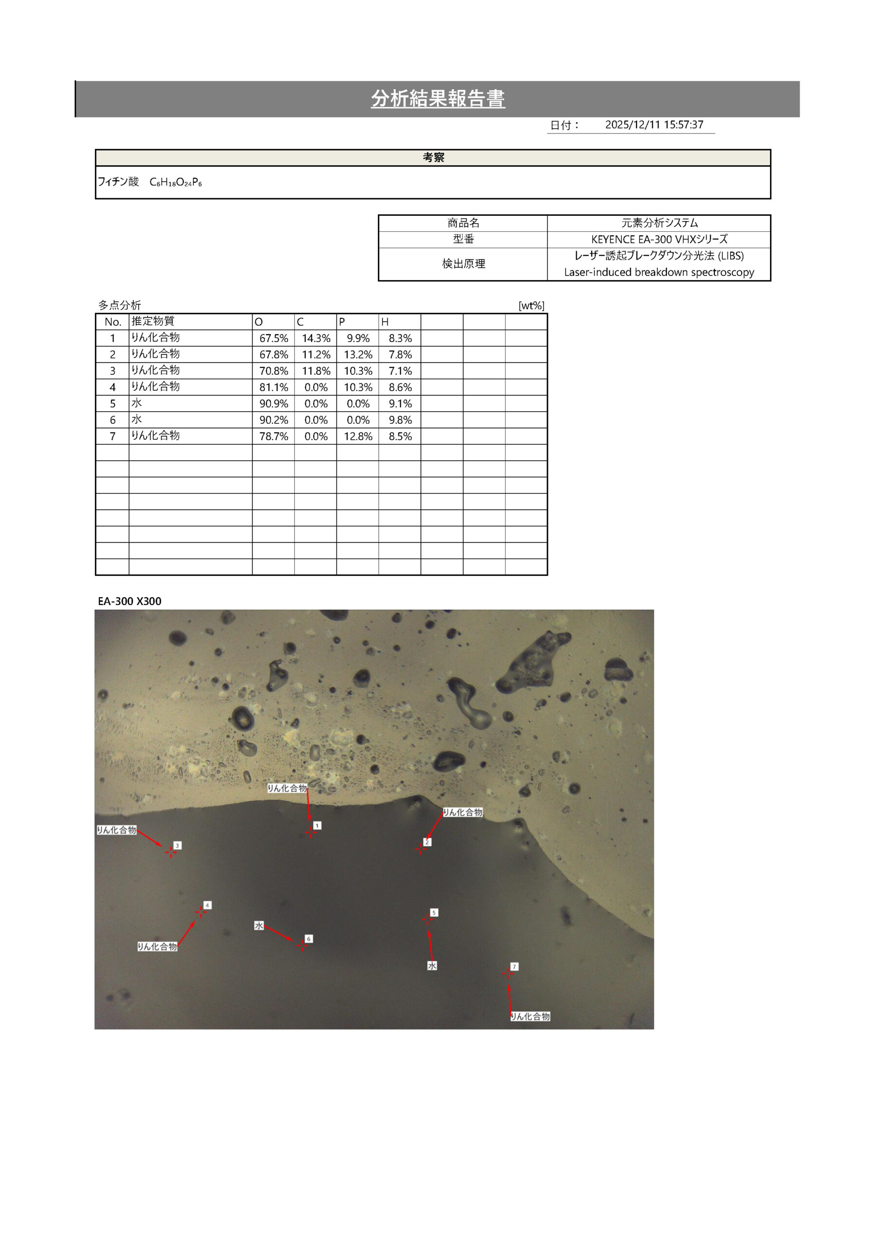 レーザー誘起ブレークダウン分光法(LIBS)による多点元素分析を実施。測定点では主にO・H・C・Pが検出され、その原子比はフィチン酸の理論組成と概ね一致しており、多リン酸基を有する有機リン酸が主要成分であることを確認しました。