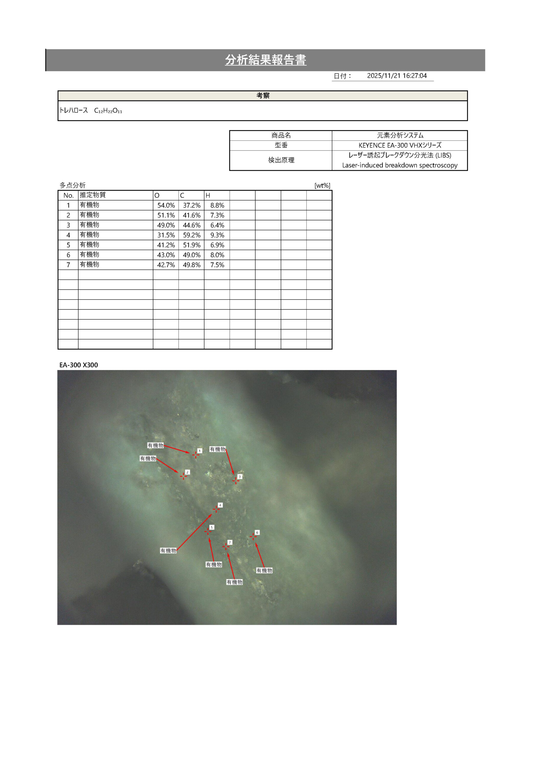 - 結果概要:O約32〜54wt%、C約37〜59wt%、H約6〜9wt%を示し、トレハロースの組成比と良好に整合する結果が得られました。