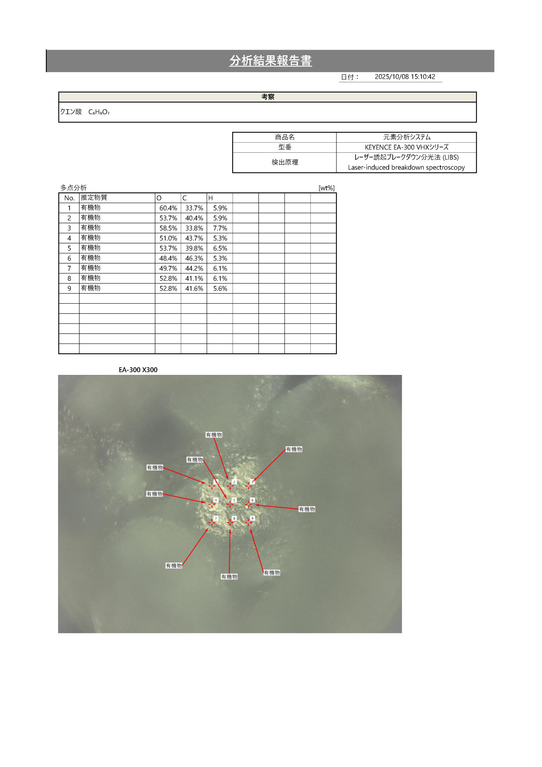 レーザー誘起ブレークダウン分光法(LIBS)による多点元素分析を実施。測定点ではC・H・Oのみが検出され、その元素比はクエン酸の理論組成と概ね一致しており、クエン酸を主成分とする有機酸であることを確認しました。
