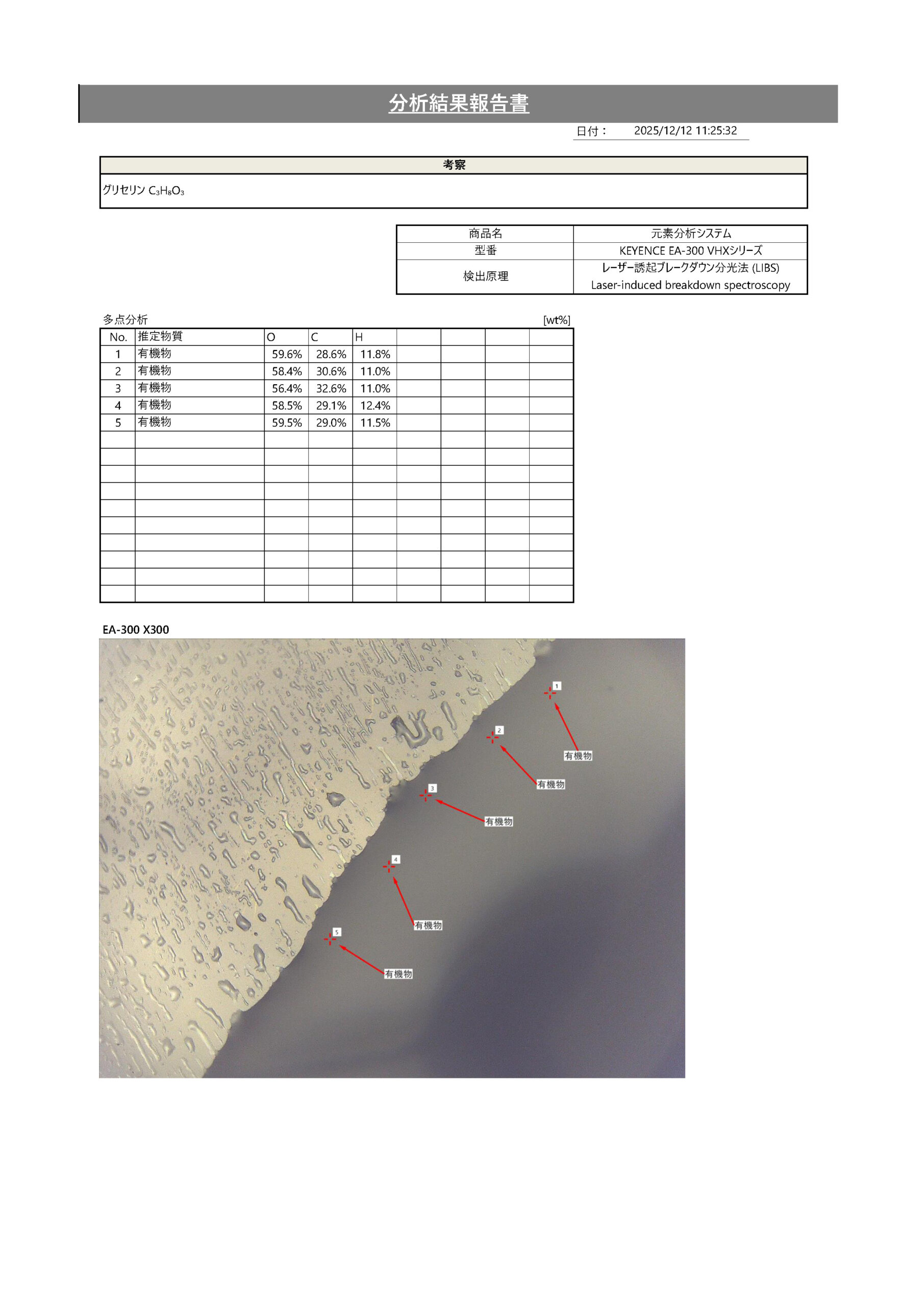 レーザー誘起ブレークダウン分光法(LIBS)による多点元素分析を実施。測定点では C・H・O のみが検出され、その元素比はグリセリンの理論組成と概ね一致しており、グリセリン由来の有機成分が主要成分であることを確認しました。