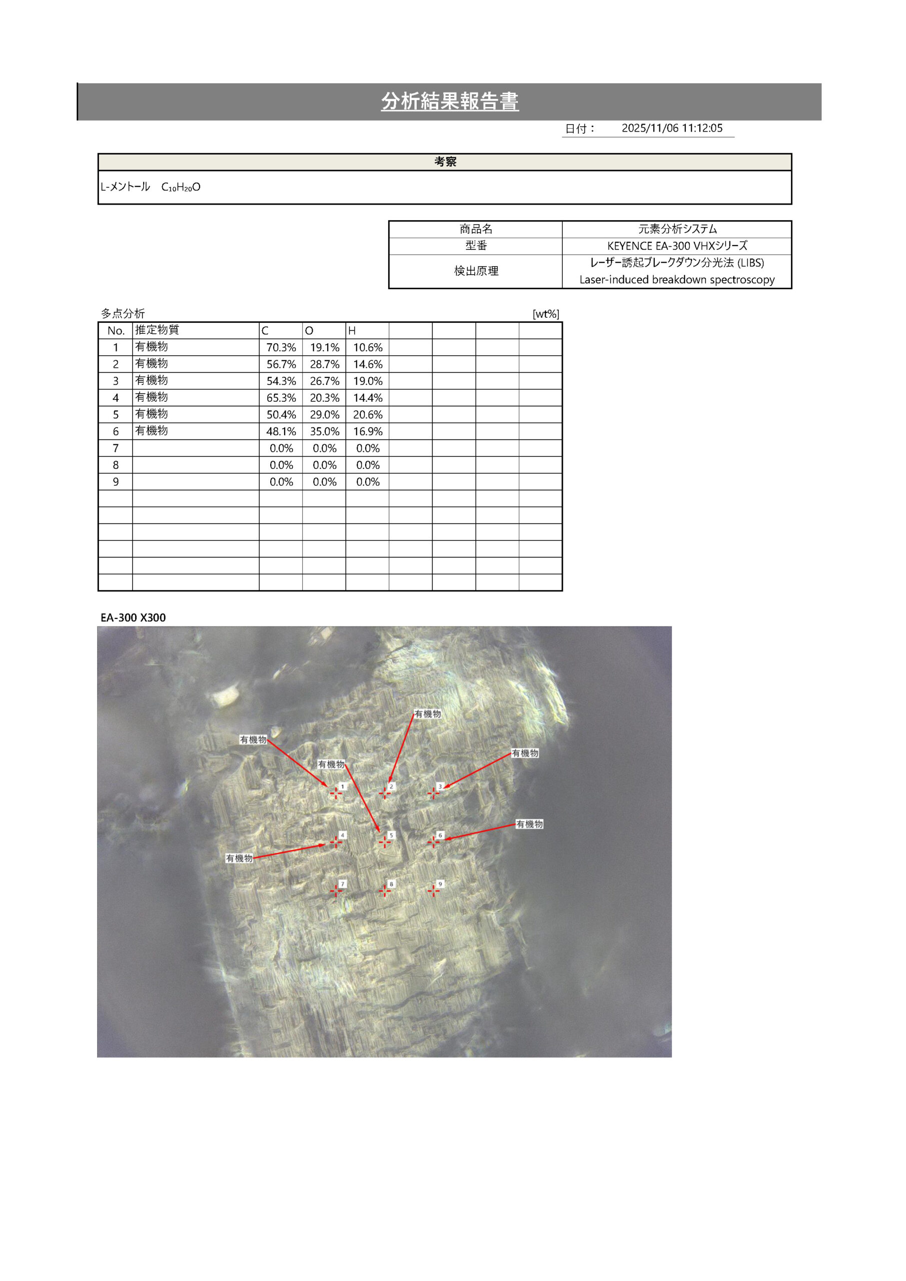- 結果概要:C約48〜70wt%、O約19〜35wt%、H約11〜21wt%を示し、これらの元素比は L-メントールの組成と概ね整合する結果が得られました。