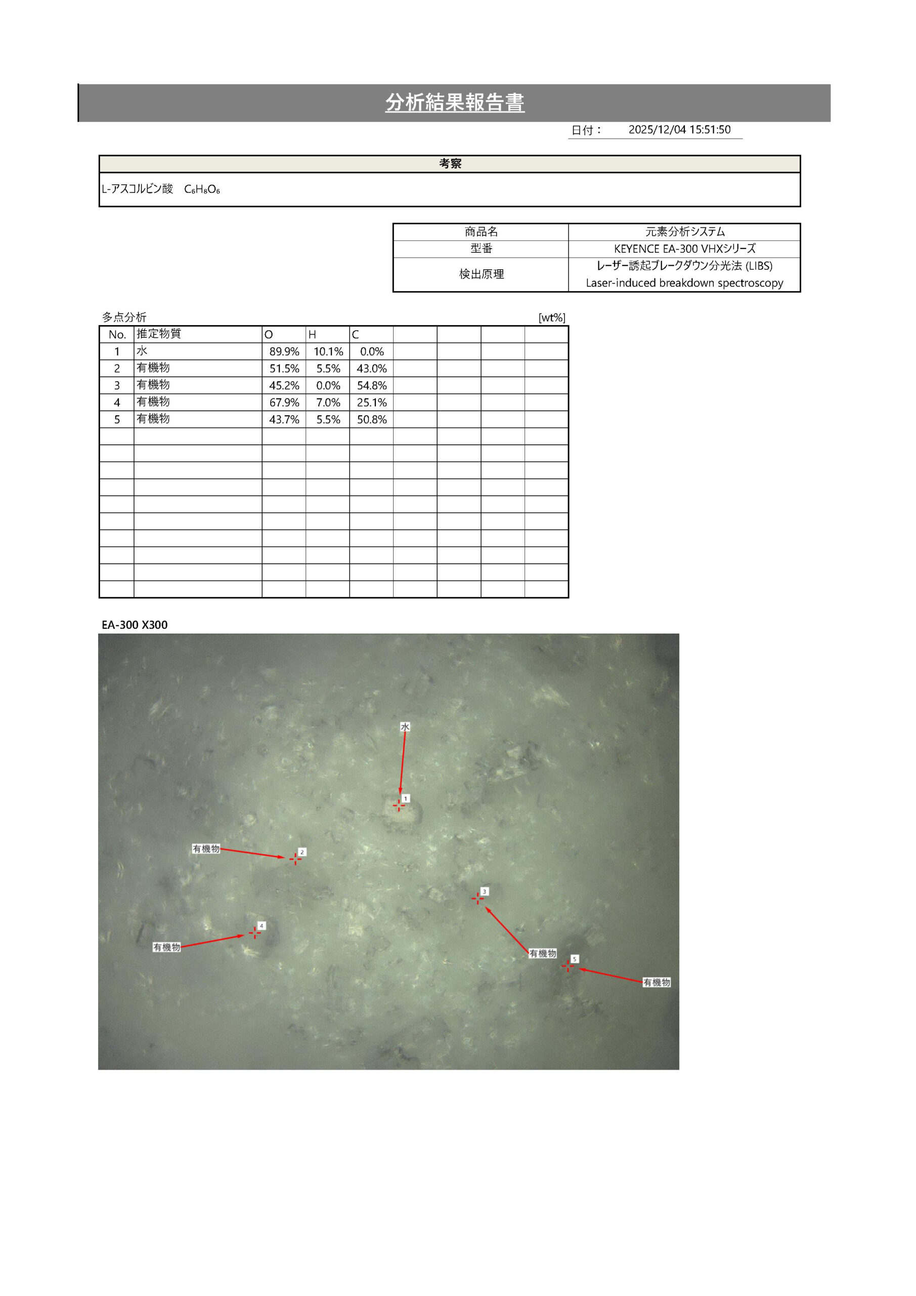 - 結果概要:有機成分ではC約25〜55wt%、O約45〜70wt%、H約0〜7wt%を示し、L-アスコルビン酸の組成比と整合する結果が得られました。